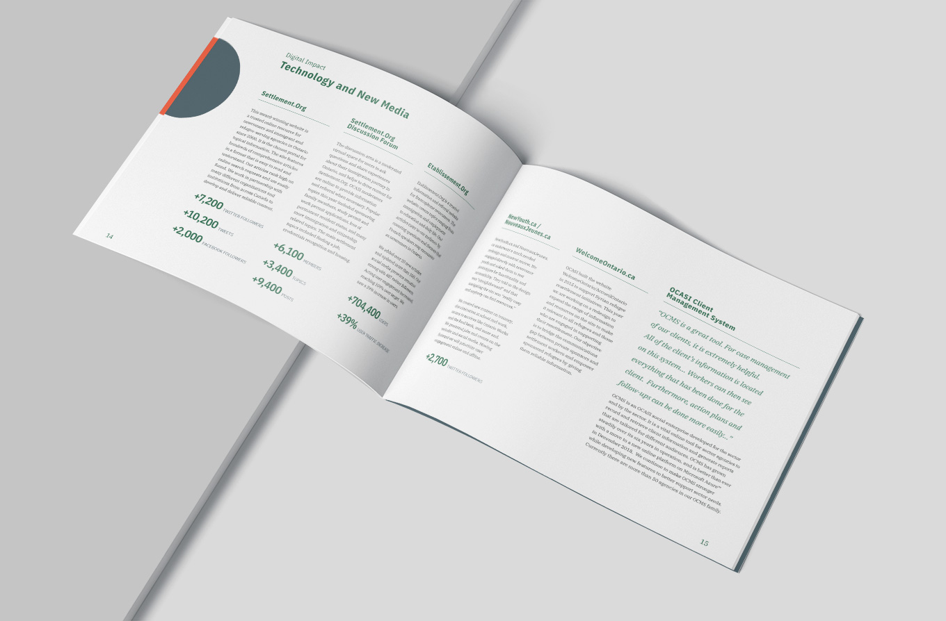 The OCASI Annual Report was a publication delivered at its annual sectorial conference. The report included ED messages, program highlights, and financial information.