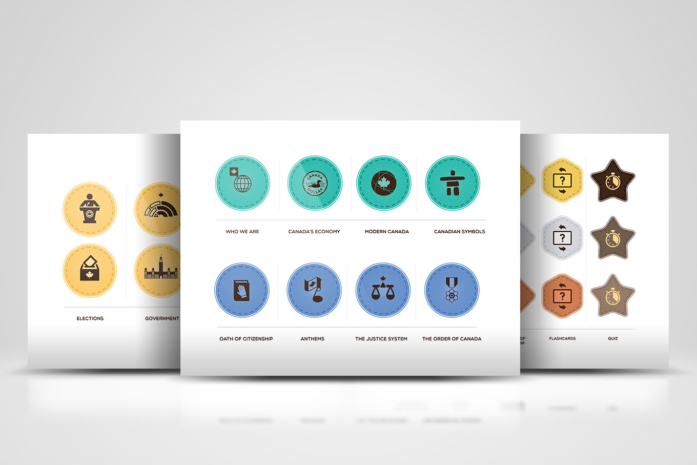 The site works with a large number of quizzes. So, I designed different combinations of solid branded colors and flat icon graphics.