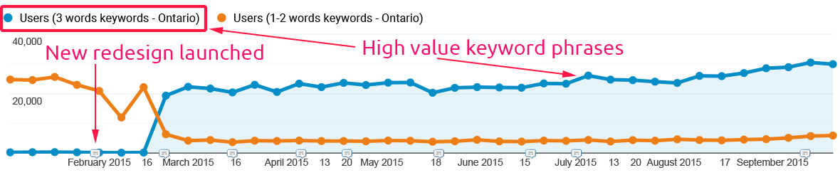 We planned six months to start seeing favorable results from the organic traffic. But, it happened in a few weeks. As a result of the new IA, 1-2 keyword phrases (low value) dropped. 2-3 keyword phrases (high value) went up by 60% in 8 months.
