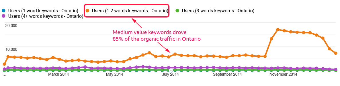 Med-tail keyword phrases were predominant. Primary and secondary 2-3 keyword phrases were 87% of organic traffic from the province. Detailed searches of 4+ keyword phrases made a 7%.