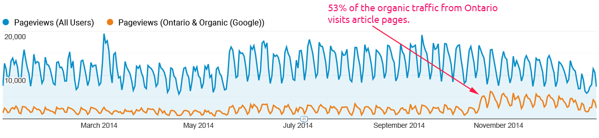 72% of the total traffic was organic. During the previous three months, Half of it was from Ontario. This type of traffic was a primary target for the organization.